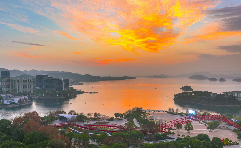 落日黄昏晓,夕阳醉晚霞。近日,傍晚时分,天空中橘色的晚霞映照在千岛湖水面,绚丽如画,也为寒冬带来了一份温暖和宁静。