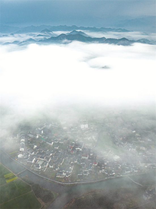 云雾时而在半山腰,时而在山顶,仿佛在轻轻抚摸群山和眼前这片村子。
