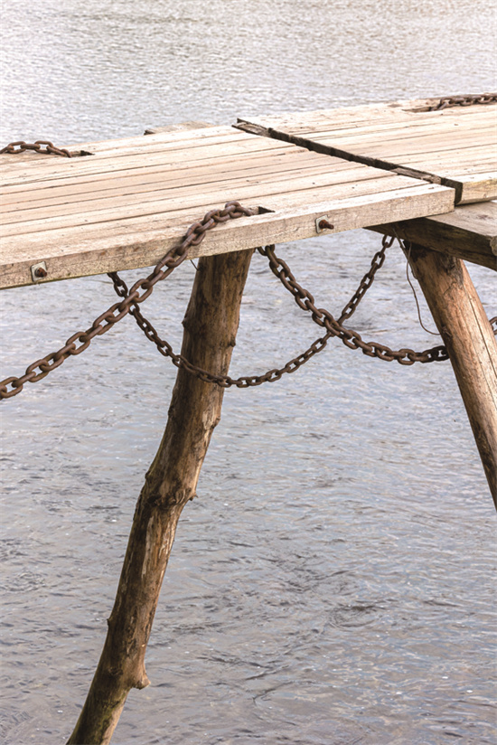 木板由铁链相连,原因是“春夏时节,洪水常把木桥冲毁,但因有铁链串系,木桥只会中间脱开,漂浮在河两边,不会被洪水卷走,洪水过后,又重新立起,屡垮屡建”。