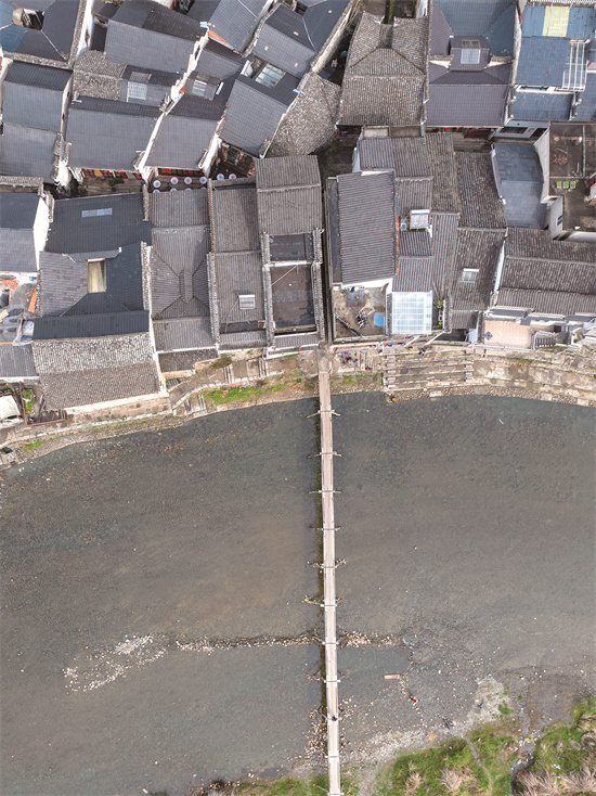 说是木桥,也可以叫做板凳桥。它是由数个八字木桩和木板搭建而成,长约80米。