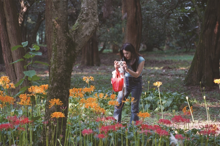近日,杭州植物园的石蒜花竞相开放,预计将于八月底进入盛花期,并持续至九月中旬。如糖果色般的石蒜花海,吸引许多游客前来赏花拍照。